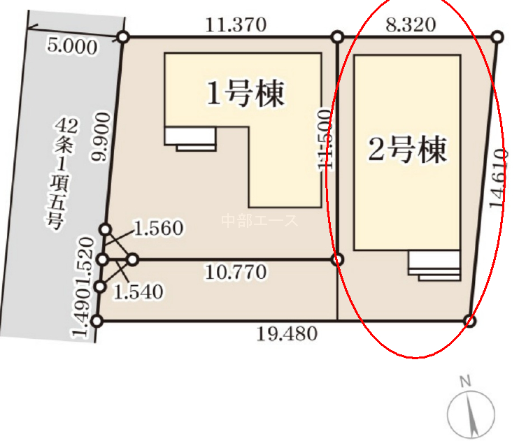 1号棟は道路に面した整形地、2号棟は1号棟の裏にある敷地延長の土地の形状です。
