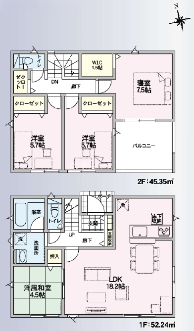 (1階)LDK18.2、(1階)和4.5、(2階)洋7.5、(2階)洋5.7、(2階)洋5.7 |